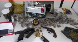 Dois homens são presos com veículo roubado; polícia encontrou drogas e armas em residência