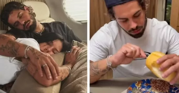 Em uma delas, estavam dormindo juntos em um jatinho particular, no qual ela seguia para cumprir sua agenda de compromissos profissionais. Já em outro registro, apareceram durante o café da manhã com pão francês e manteiga.
