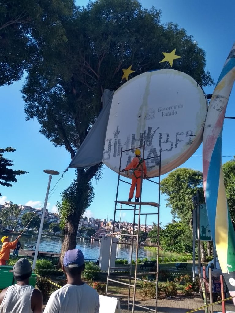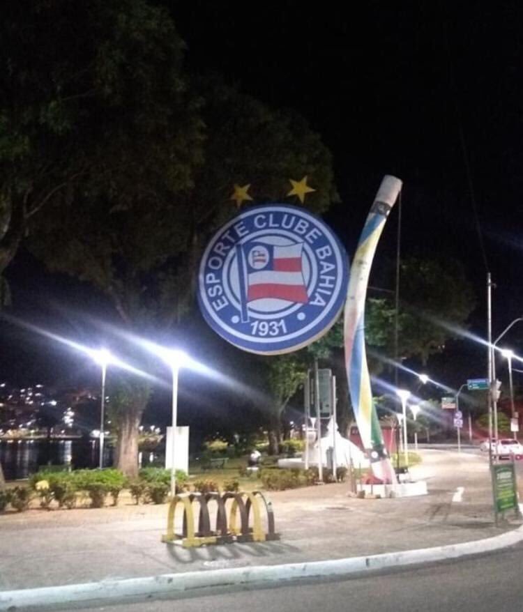 A estrutura do antigo relógio que fazia a contagem regressiva para a Copa do Mundo no Brasil, instalado em frente à Arena Fonte Nova, no Dique do Tororó, recebeu ontem (9) uma plotagem do escudo do Esporte Clube Bahia. No entanto, a “homenagem” não durou 24 horas: na manhã de hoje (10), o brasão já havia sido retirado.