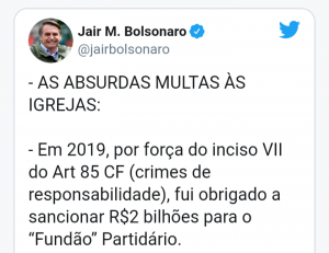 Em publicação nas redes sociais, o presidente Bolsonaro sugeriu, entretanto, que os parlamentares derrubem os vetos, para que as dívidas de igrejas sejam perdoadas, e explicou que só não manteve o dispositivo para evitar “um quase certo processo de impeachment”.
