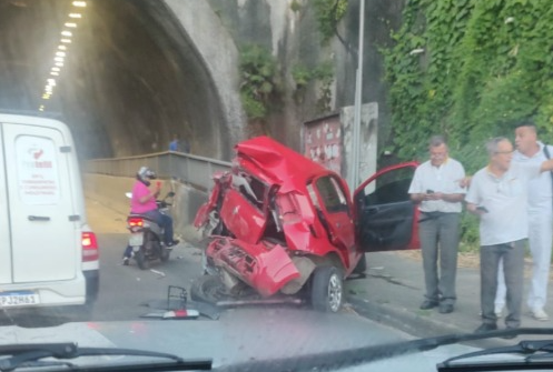 Um carro ficou completamente destruído após se envolver em um acidente com um ônibus no início da manhã desta quarta-feira, 30, no túnel da Ligação Lobato-Pirajá, em Salvador. Apesar do impacto e da gravidade do acidente, ninguém ficou gravemente ferido.