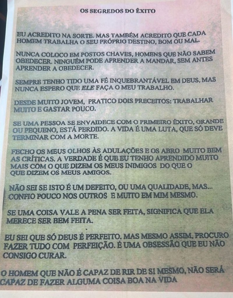 O documento, nomeado como “Os segredos do êxito”, Senor Abravanel detalha uma espécie de mandamentos sobre seu comportamento para alcançar o sucesso. O ex-apresentador destaca na carta a necessidade de economizar, de escolher bem seus aliados e de não confiar nos outros.
