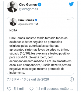 “Ciro Gomes, mesmo tendo tomado todos os cuidados e de ter seguido todos os protocolos exigidos pelas autoridades sanitárias, apresentou sintomas leves de gripe no último sábado (10/10), fez o exame e testou positivo para covid-19. Ele está bem, com acompanhamento médico e em isolamento em casa. Sua companheira, Giselle Bezerra, testou negativo, mas segue mesmo protocolo de isolamento”, diz a nota.