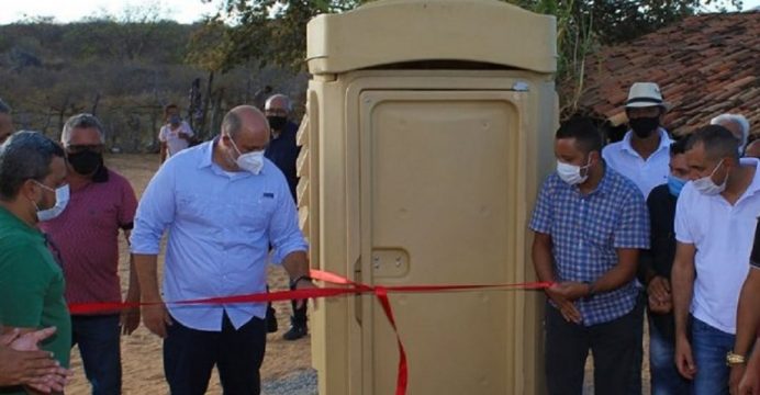 Com pompa de grande obra, prefeito inaugura sanitário químico no interior da Bahia