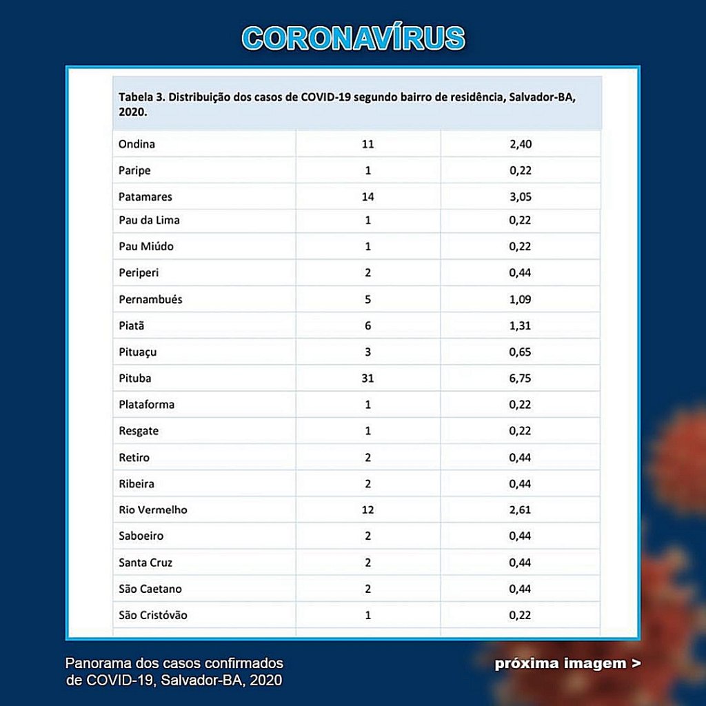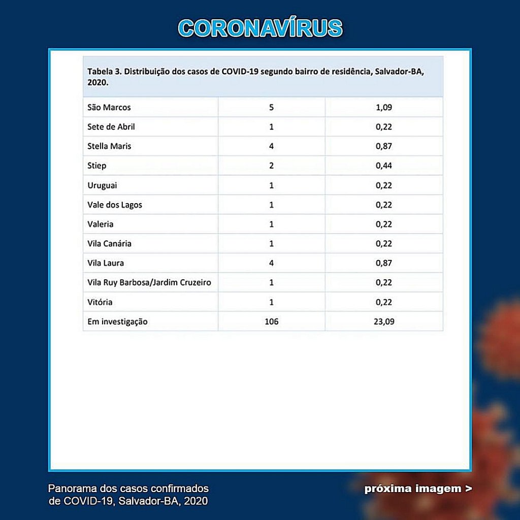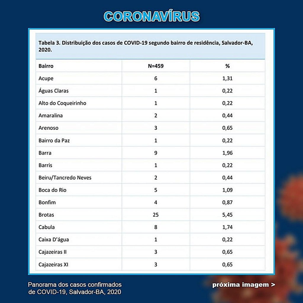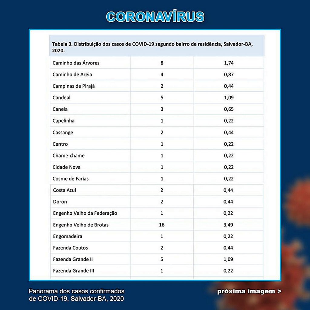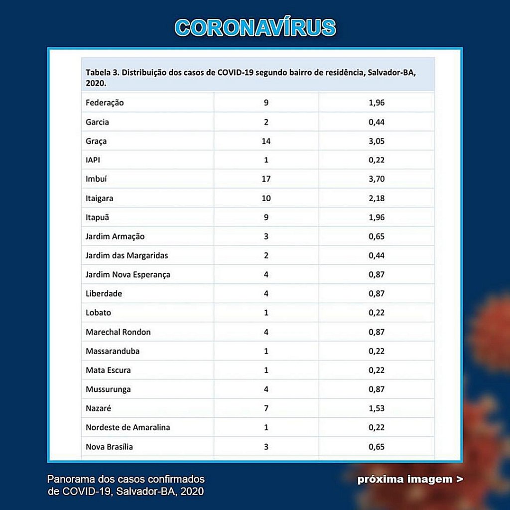 Desde o início da pandemia, a Pituba é o principal bairro com os casos da doença. Já Brotas e Imbuí representam um grande crescimento da incidência de pessoas contaminadas. Em relação ao boletim divulgado no último dia 7 de abril, o aumento foi de 36% e 52,94%, respectivamente.