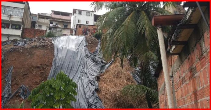 A região é protegida por uma lona, mas durante as chuvas, a terra rompeu a contenção e deslizou pelo local, chegando próximo das casas. Apesar da situação, não há registro de feridos.