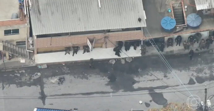Um vídeo de drone gravado pela polícia mostra o momento em que criminosos fortemente armados se reuniam no alto do Complexo da Penha, na Zona Norte do Rio de Janeiro, pouco antes de fugirem pela mata durante a megaoperação das forças de segurança realizada na última terça-feira (28).