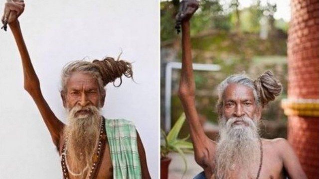 Um sadhu indiano chamado Amar Bharati mantém o braço direito levantado há mais de 45 anos. Segundo reportagem do EXTRA, o homem decidiu dar uma virada na sua vida levantando o braço, e nunca mais tocou sua cintura desde então. Após tanto tempo o braço acabou ficando atrofiado.