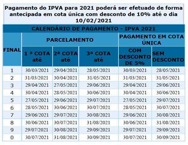 Os débitos referentes à taxa de licenciamento e às multas de trânsito deverão ser pagos até a data de vencimento da terceira parcela. Os débitos anteriores do IPVA ainda não notificados também podem ser divididos em três vezes, juntamente com o IPVA 2021. No entanto, o proprietário que perder o prazo da primeira cota deixa de ter o direito ao parcelamento em três vezes. O pagamento do tributo referente a embarcações e aeronaves deverá ser efetuado até 1º de junho de 2021.