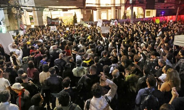 Durante o ato, os manifestantes gritaram: “Ei Vorcaro, cadê a delação?”. Também colocaram nos tapumes fotos dos investigados e faixas, entre elas a frase: “Basta, fora Vorcaro”. Uma equipe da Polícia Militar foi acionada para acompanhar o protesto, que seguia pacífico até a última atualização desta reportagem.