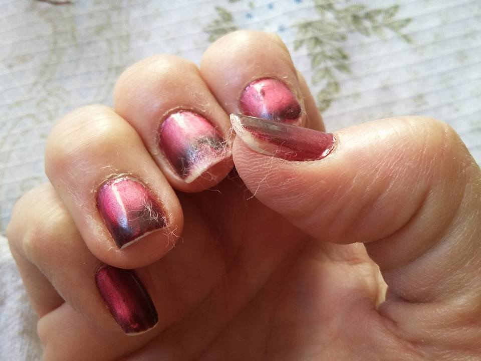 Nos comentários, algumas outras clientes relataram o mesmo problema com o produto e publicaram fotos que mostravam a situação da unha no momento da retirada do esmalte. O efeito degradê que parece mágica, acontece quando a ponta da unha é encostada no ímã localizado tampinha do frasco, o que fez surgir a dúvida se o produto poderia ter chumbo em sua composição