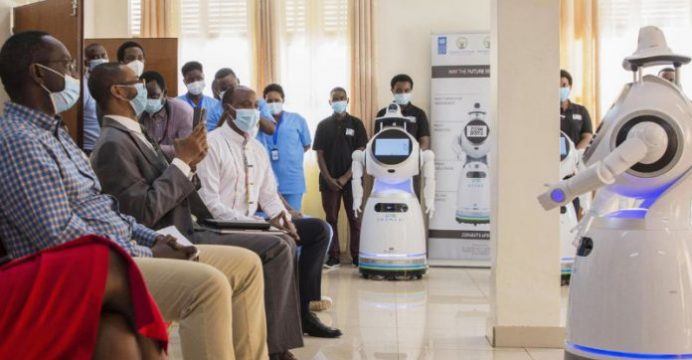 Os robôs usados nos centros de tratamento em Kigali, Ruanda fazem a triagem e ajudam rastrear as pessoas que tem covid e ainda saber sobre sua alimentação e necessidade de medicamentos entre outras tarefas.