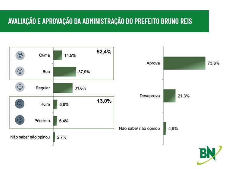Levantamento realizado pelo Instituto Paraná Pesquisas em parceria com o Bahia Notícias concluiu que 84,2% dos soteropolitanos avaliam de forma positiva a administração do prefeito Bruno Reis (DEM). O levantamento ouviu 512 habitantes de Salvador, com idades a partir de 16 anos. Destes, 14,5% classificam o governo como “ótimo”; 37,9% como “bom” e outros 31,8% consideram a administração “regular”.