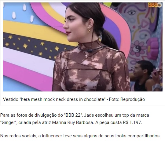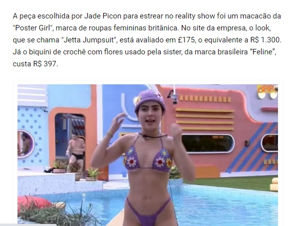 A influenciadora digital Jade Picon tem chamado atenção ao desfilar no BBB22 com seus looks com valores bem fora da média nacional, até mesmo na hora de dormir. Na primeira noite na casa, ela exibiu um pijama da marca australiana “My Mum Made It”. A combinação da calça “soft rib twist lounge pants” com a blusa “soft rib twist top” alcança a média de R$ 800.
