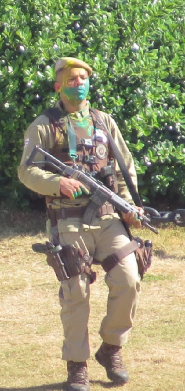 O soldado que invadiu a barreira de proteção pintou o rosto de verde e amarelo – cores da bandeira do Brasil – antes de realizar os disparos para cima no início da tarde.