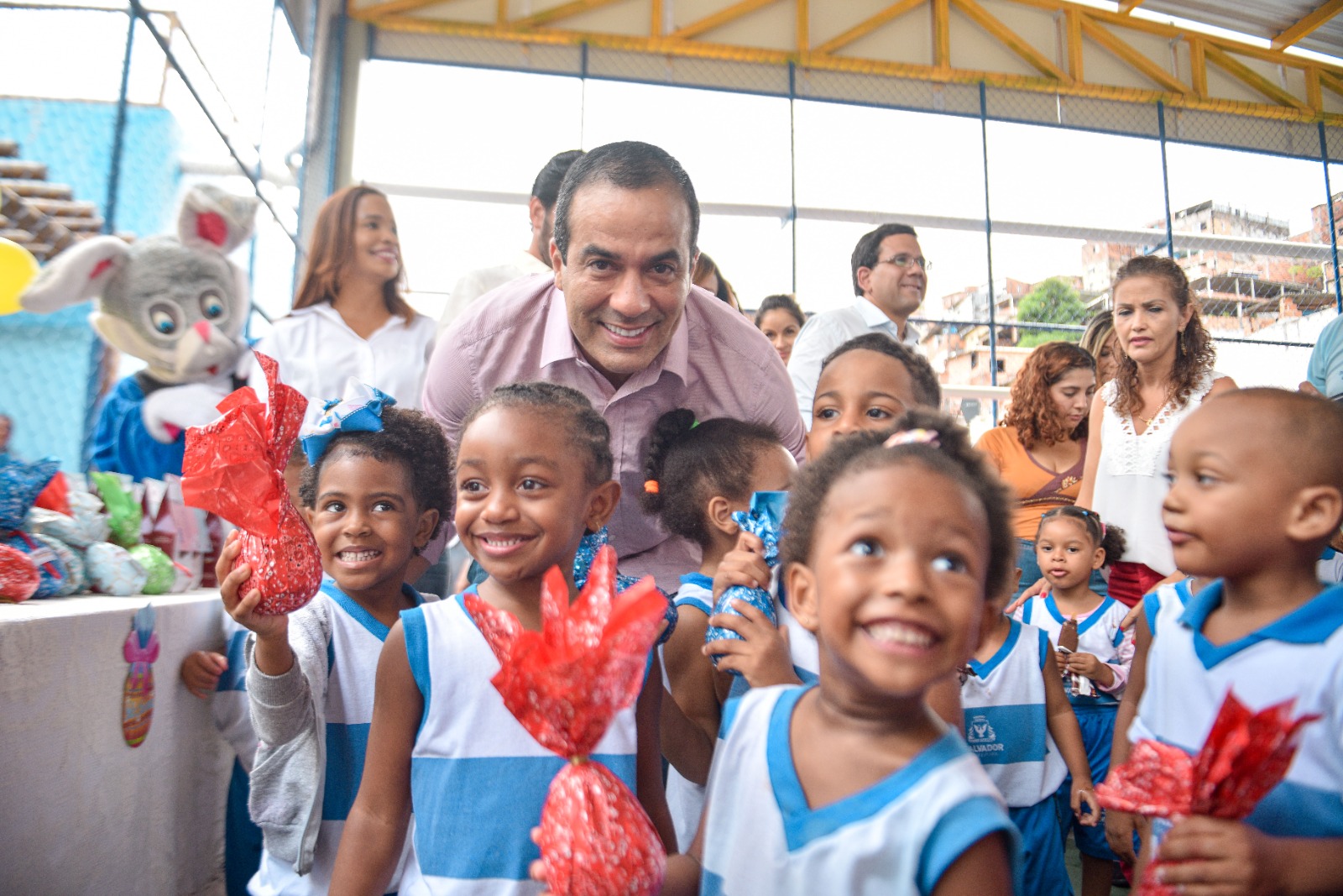 Música, teatro, brincadeiras e a visita esperada do coelhinho da Páscoa com muitos ovos de chocolate. Essa miscelânea de alegria e sabor marcou a manhã de centenas de alunos da Rede Municipal de Ensino nesta quarta-feira (5), no Centro Municipal de Educação Infantil (Cmei) Luís Eduardo Magalhães, na Avenida Bonocô. O evento contou com a participação do prefeito Bruno Reis, da vice-prefeita e secretária da Saúde (SMS), Ana Paula Matos, e do secretário municipal da Educação (Smed), Thiago Dantas, que entregaram os chocolates às crianças.
