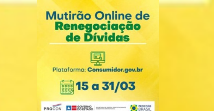 O Procon-BA realizará, entre os dias 15 e 31 de março de 2021, um mutirão online de renegociação de dívidas. A ação, de iniciativa da Associação Brasileira de Procons (Procon Brasil), conta com a participação da Superintendência de Proteção e Defesa do Consumidor da Bahia (Procon-BA), e da Federação Brasileira de Bancos (Febraban), acontecerá exclusivamente pela internet, através da plataforma de solução de conflitos Consumidor.GOV (www.consumidor.gov.br).