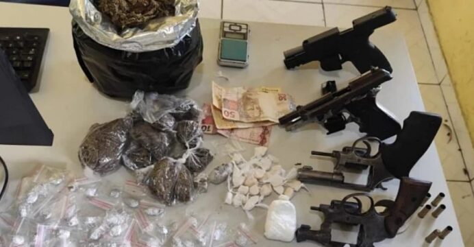 Com os suspeitos, foram apreendidas duas pistolas (calibres 9mm e .380), dois revólveres calibre .38, 78 buchas e 13 porções grandes de maconha, 21 porções e 5 pinos de cocaína, uma porção de pasta base de cocaína, uma sacola com maconha in natura, além de uma balança de precisão, um celular e R$ 100 em espécie.