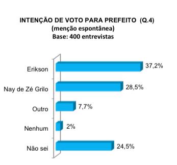 Na espontânea, Erikson também lidera com 37,2%, ao passo que Nay surge com 28,5%. Outros nomes foram citados por por 7,7% no eleitorado, 2% não votariam em nenhum dos candidatos e 24,5% não sabiam em quem votar.