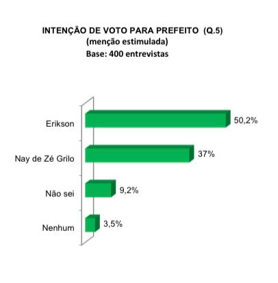 Na consulta estimulada, quando ao entrevistado é mostrado o nome dos candidatos, Eriksson aparece com 50,2% das intenções de voto, enquanto a segunda colocada, Nay de Zé Grilo (PP), tem 37%. Não souberam responder foram 9,2% e não votariam em nenhum dos dois 3,5%.