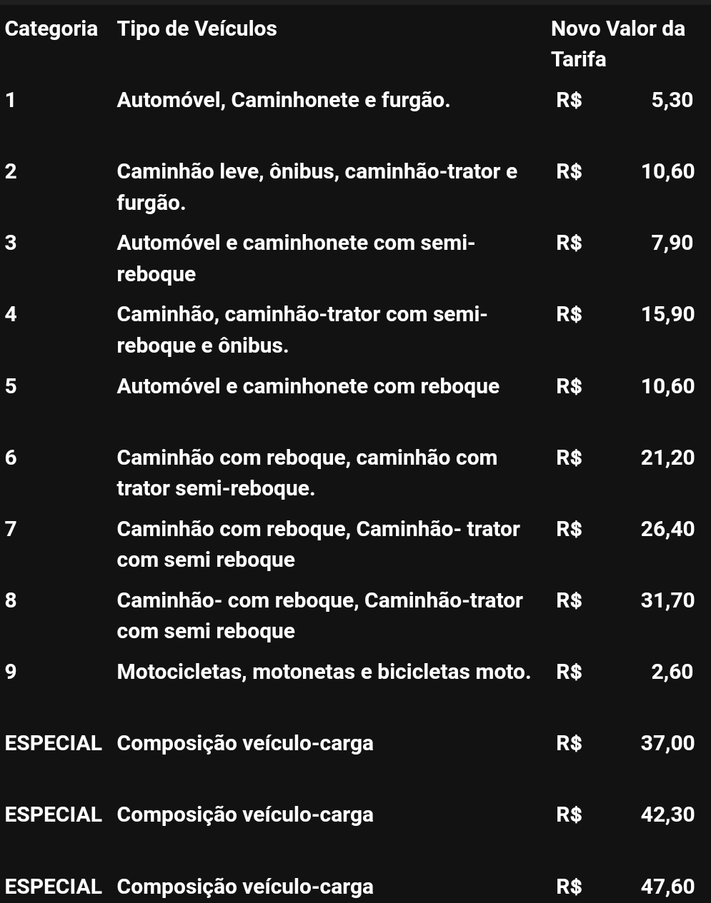 Calculado a partir da variação do Índice Nacional de Preços ao Consumidor Amplo (IPCA), o percentual aprovado foi de 7,19%. O reajuste contratual, é anual e tem como data base o mês de abril. Os novos valores a serem aplicados em outras categorias de veículos, a partir de cálculo proporcional, podem ser conferidos na tabela a seguir.