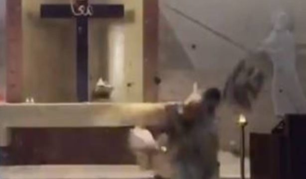 Dentro de uma igreja, ele é atingido por escombros que caem do teto. A cena estava sendo transmitida ao vivo para fiéis da igreja.