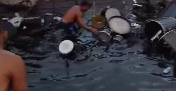 Nas imagens enviadas ao Bnews, alguns equipamentos aparecem submersos e músicos desesperados para salvar alguns itens. Ainda nos registros, uma pessoa critica a falta de vistoria na balsa.