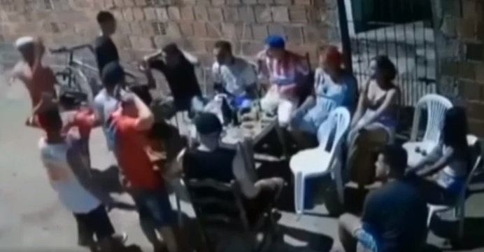Nas imagens, gravadas por uma câmera de segurança, é possível ver o momento em que os homens chegam e que o primeiro assaltante, de camisa rosa, aponta a arma para os familiares. Enquanto isso, o outro, de camisa preta, recolhe celulares, dinheiro e outros pertences.